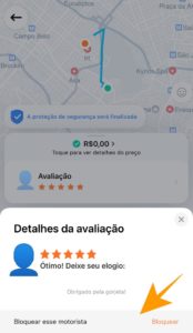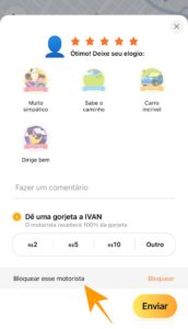 Assim que a sua corrida for finalizada, vai aparecer a opção para você fazer a avaliação do motorista e junto você vai ter o campo para “bloquear” o motorista, ou seja, tirar ele do seu radar e não realizar mais corridas com ele. Olha aqui embaixo como fica: