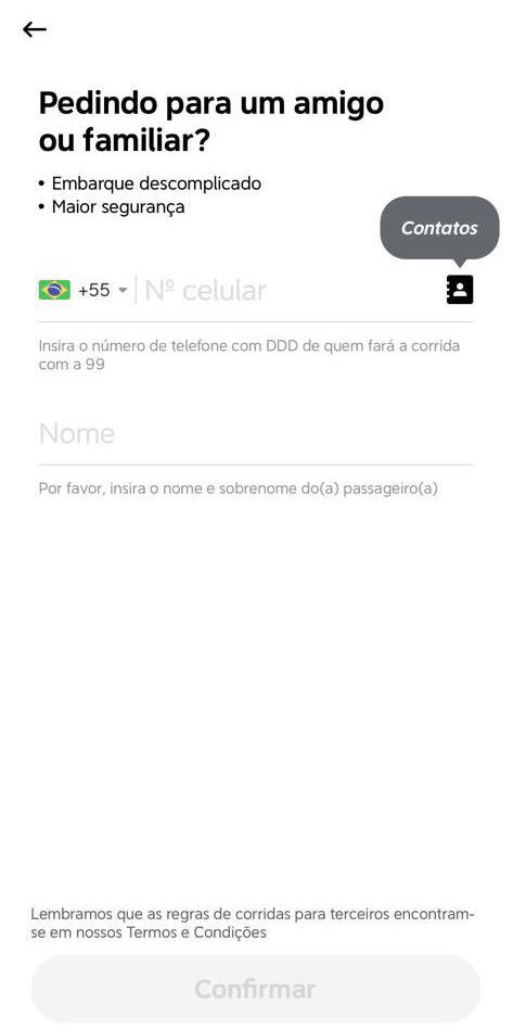 Para chamar uma corrida para um amigo ou familiar pela sua conta no app, basta preencher a seção “Mudar o passageiro” no momento de solicitar a viagem. Veja como:
